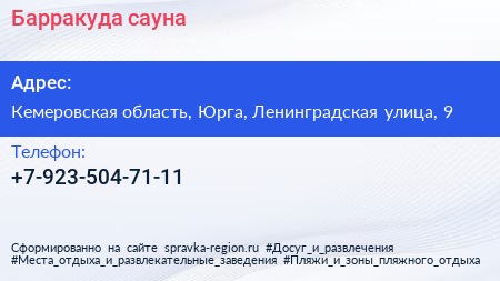 Барракуда, сауна по адресу Кемеровская область, Юрга, Ленинградская улица, 9 в дальнейшем Организация, размещена в следующих категориях: