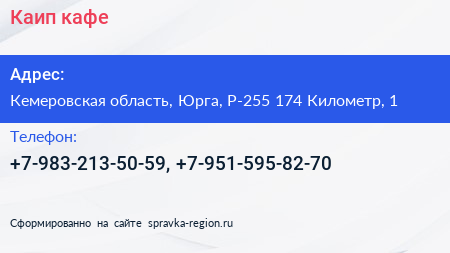 Каип, кафе по адресу Кемеровская область, Юрга, Р-255 174 Километр, 1 в дальнейшем Организация, размещена в следующих категориях:
