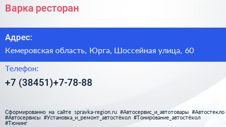 Варка, ресторан по адресу Кемеровская область, Юрга, Шоссейная улица, 60 в дальнейшем Организация, размещена в следующих категориях: