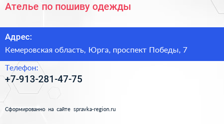 Ателье по пошиву одежды по адресу Кемеровская область, Юрга, проспект Победы, 7 в дальнейшем Организация, размещена в следующих категориях: