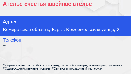 Ателье счастья, швейное ателье по адресу Кемеровская область, Юрга, Комсомольская улица, 2 в дальнейшем Организация, размещена в следующих категориях: