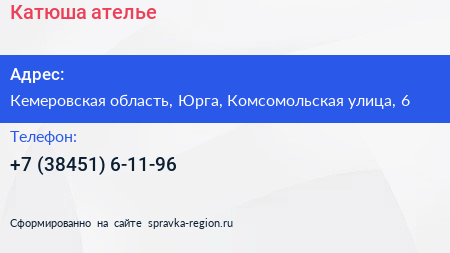 Катюша, ателье по адресу Кемеровская область, Юрга, Комсомольская улица, 6 в дальнейшем Организация, размещена в следующих категориях:
