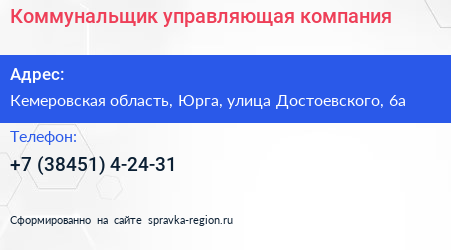 Коммунальщик, управляющая компания по адресу Кемеровская область, Юрга, улица Достоевского, 6а в дальнейшем Организация, размещена в следующих категориях: