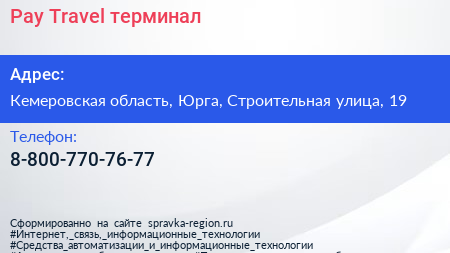 Pay.Travel, терминал по адресу Кемеровская область, Юрга, Строительная улица, 19 в дальнейшем Организация, размещена в следующих категориях: