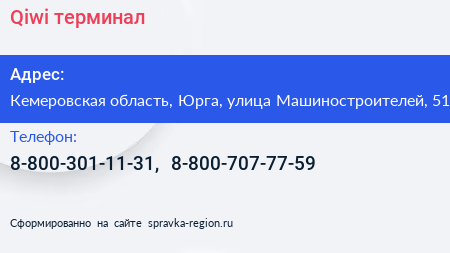Qiwi, терминал по адресу Кемеровская область, Юрга, улица Машиностроителей, 51 в дальнейшем Организация, размещена в следующих категориях:
