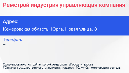 Ремстрой индустрия, управляющая компания по адресу Кемеровская область, Юрга, Новая улица, 8 в дальнейшем Организация, размещена в следующих категориях: