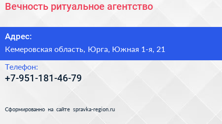 Вечность, ритуальное агентство по адресу Кемеровская область, Юрга, Южная 1-я, 21 в дальнейшем Организация, размещена в следующих категориях: