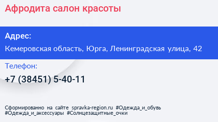 Афродита, салон красоты по адресу Кемеровская область, Юрга, Ленинградская улица, 42 в дальнейшем Организация, размещена в следующих категориях: