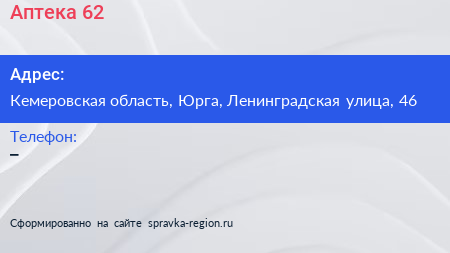 Аптека №62 по адресу Кемеровская область, Юрга, Ленинградская улица, 46 в дальнейшем Организация, размещена в следующих категориях: