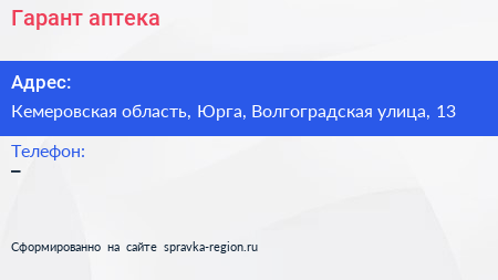 Гарант, аптека по адресу Кемеровская область, Юрга, Волгоградская улица, 13 в дальнейшем Организация, размещена в следующих категориях: