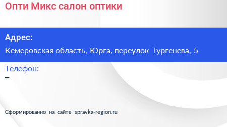 Опти-Микс, салон оптики по адресу Кемеровская область, Юрга, переулок Тургенева, 5 в дальнейшем Организация, размещена в следующих категориях: