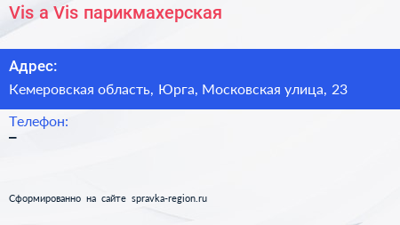 Vis-a-Vis, парикмахерская по адресу Кемеровская область, Юрга, Московская улица, 23 в дальнейшем Организация, размещена в следующих категориях:
