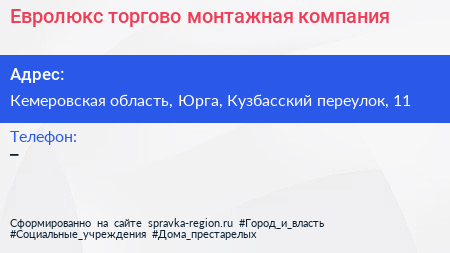 Евролюкс, торгово-монтажная компания по адресу Кемеровская область, Юрга, Кузбасский переулок, 11 в дальнейшем Организация, размещена в следующих категориях: