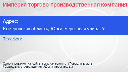 Империя, торгово-производственная компания по адресу Кемеровская область, Юрга, Береговая улица, 9 в дальнейшем Организация, размещена в следующих категориях: