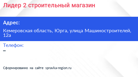 Лидер-2, строительный магазин по адресу Кемеровская область, Юрга, улица Машиностроителей, 12а в дальнейшем Организация, размещена в следующих категориях: