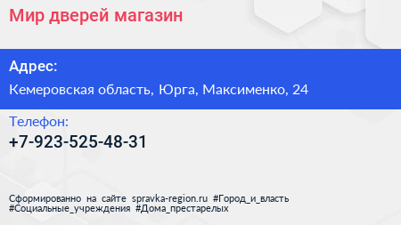 Мир дверей, магазин по адресу Кемеровская область, Юрга, Максименко, 24 в дальнейшем Организация, размещена в следующих категориях: