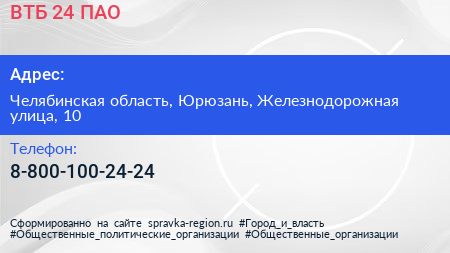 ВТБ 24, ПАО по адресу Челябинская область, Юрюзань, Железнодорожная улица, 10 в дальнейшем Организация, размещена в следующих категориях: