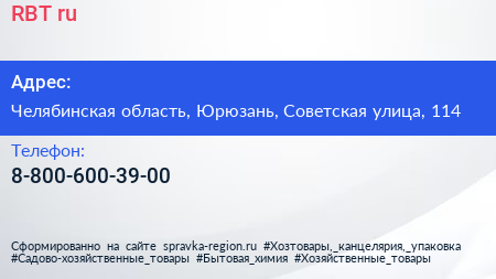 RBT.ru по адресу Челябинская область, Юрюзань, Советская улица, 114 в дальнейшем Организация, размещена в следующих категориях: