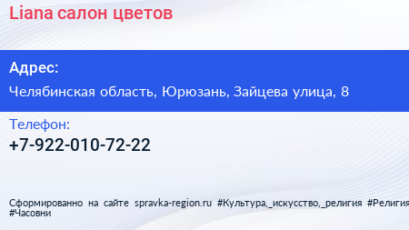 Liana, салон цветов по адресу Челябинская область, Юрюзань, Зайцева улица, 8 в дальнейшем Организация, размещена в следующих категориях: