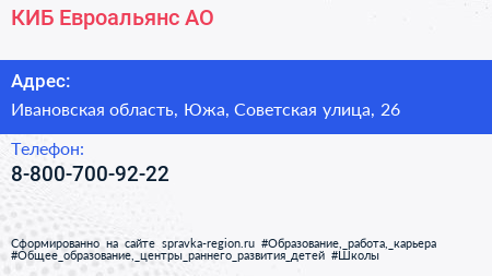 КИБ Евроальянс, АО по адресу Ивановская область, Южа, Советская улица, 26 в дальнейшем Организация, размещена в следующих категориях: