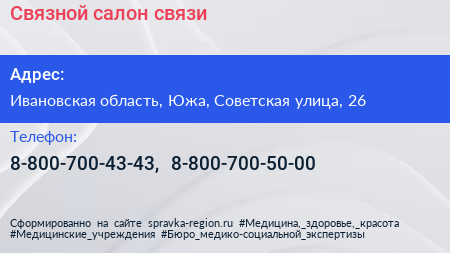 Связной, салон связи по адресу Ивановская область, Южа, Советская улица, 26 в дальнейшем Организация, размещена в следующих категориях: