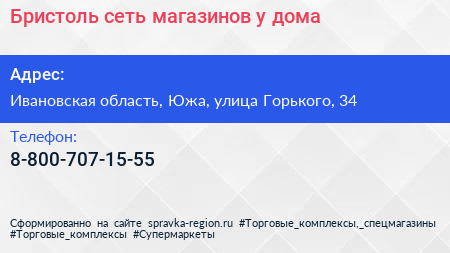 Бристоль, сеть магазинов у дома по адресу Ивановская область, Южа, улица Горького, 34 в дальнейшем Организация, размещена в следующих категориях: