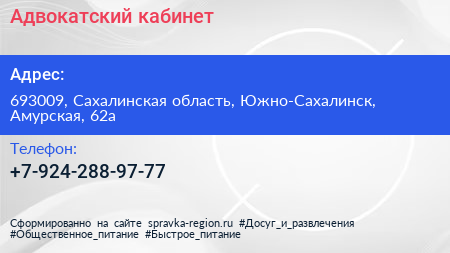 Адвокатский кабинет по адресу 693009, Сахалинская область, Южно-Сахалинск, Амурская, 62а в дальнейшем Организация, размещена в следующих категориях: