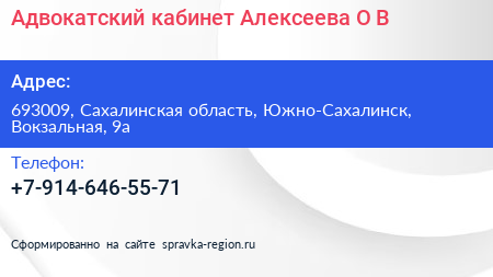 Адвокатский кабинет Алексеева О.В. по адресу 693009, Сахалинская область, Южно-Сахалинск, Вокзальная, 9а в дальнейшем Организация, размещена в следующих категориях: