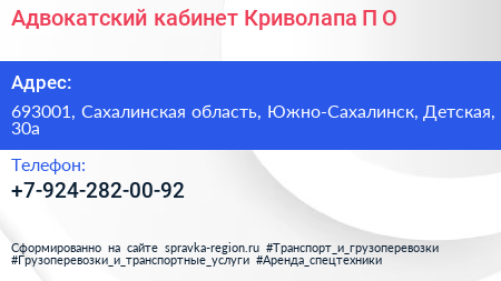 Адвокатский кабинет Криволапа П.О. по адресу 693001, Сахалинская область, Южно-Сахалинск, Детская, 30а в дальнейшем Организация, размещена в следующих категориях: