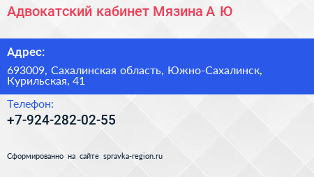 Адвокатский кабинет Мязина А.Ю. по адресу 693009, Сахалинская область, Южно-Сахалинск, Курильская, 41 в дальнейшем Организация, размещена в следующих категориях:
