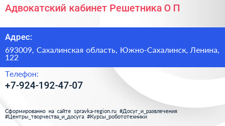 Адвокатский кабинет Решетника О.П. по адресу 693009, Сахалинская область, Южно-Сахалинск, Ленина, 122 в дальнейшем Организация, размещена в следующих категориях: