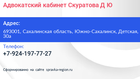 Адвокатский кабинет Скуратова Д.Ю. по адресу 693001, Сахалинская область, Южно-Сахалинск, Детская, 30а в дальнейшем Организация, размещена в следующих категориях: