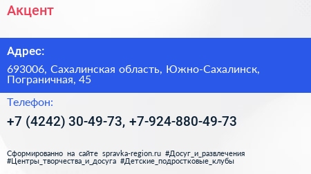 Акцент по адресу 693006, Сахалинская область, Южно-Сахалинск, Пограничная, 45 в дальнейшем Организация, размещена в следующих категориях: