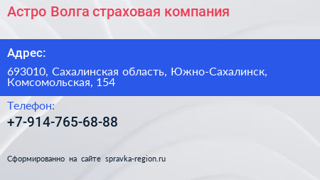 Астро-Волга, страховая компания по адресу 693010, Сахалинская область, Южно-Сахалинск, Комсомольская, 154 в дальнейшем Организация, размещена в следующих категориях: