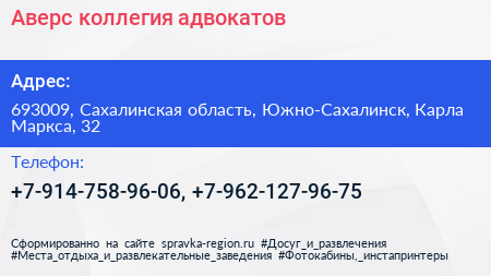 Аверс, коллегия адвокатов по адресу 693009, Сахалинская область, Южно-Сахалинск, Карла Маркса, 32 в дальнейшем Организация, размещена в следующих категориях: