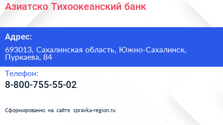 Азиатско-Тихоокеанский банк по адресу 693013, Сахалинская область, Южно-Сахалинск, Пуркаева, 84 в дальнейшем Организация, размещена в следующих категориях: