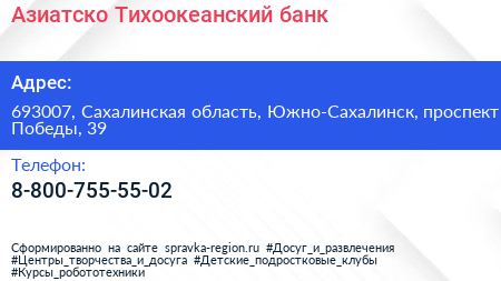 Азиатско-Тихоокеанский банк по адресу 693007, Сахалинская область, Южно-Сахалинск, проспект Победы, 39 в дальнейшем Организация, размещена в следующих категориях: