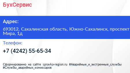 БухСервис по адресу 693012, Сахалинская область, Южно-Сахалинск, проспект Мира, 1д в дальнейшем Организация, размещена в следующих категориях: