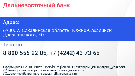 Дальневосточный банк по адресу 693007, Сахалинская область, Южно-Сахалинск, Дзержинского, 40 в дальнейшем Организация, размещена в следующих категориях: