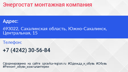 Энергостат, монтажная компания по адресу 693022, Сахалинская область, Южно-Сахалинск, Центральная, 15 в дальнейшем Организация, размещена в следующих категориях: