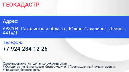ГЕОКАДАСТР по адресу 693004, Сахалинская область, Южно-Сахалинск, Ленина, 441а/1 в дальнейшем Организация, размещена в следующих категориях: