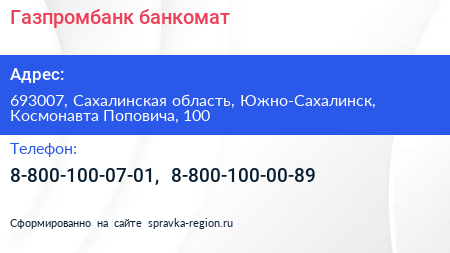 Газпромбанк, банкомат по адресу 693007, Сахалинская область, Южно-Сахалинск, Космонавта Поповича, 100 в дальнейшем Организация, размещена в следующих категориях: