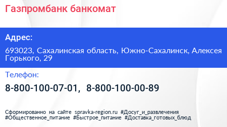 Газпромбанк, банкомат по адресу 693023, Сахалинская область, Южно-Сахалинск, Алексея Горького, 29 в дальнейшем Организация, размещена в следующих категориях: