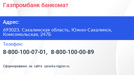 Газпромбанк, банкомат по адресу 693023, Сахалинская область, Южно-Сахалинск, Комсомольская, 247Б в дальнейшем Организация, размещена в следующих категориях: