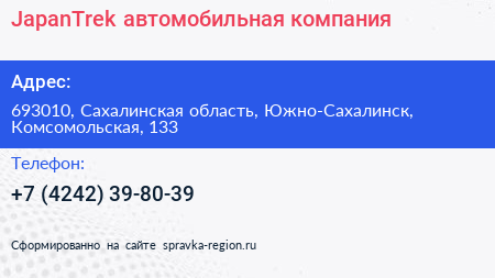 JapanTrek, автомобильная компания по адресу 693010, Сахалинская область, Южно-Сахалинск, Комсомольская, 133 в дальнейшем Организация, размещена в следующих категориях: