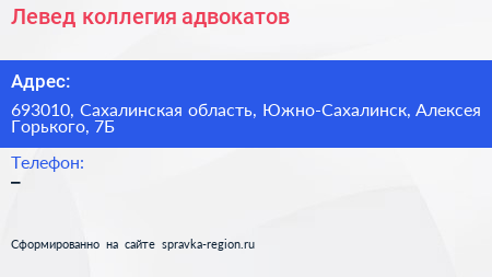 Левед, коллегия адвокатов по адресу 693010, Сахалинская область, Южно-Сахалинск, Алексея Горького, 7Б в дальнейшем Организация, размещена в следующих категориях:
