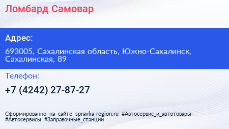 Ломбард Самовар по адресу 693005, Сахалинская область, Южно-Сахалинск, Сахалинская, 89 в дальнейшем Организация, размещена в следующих категориях: