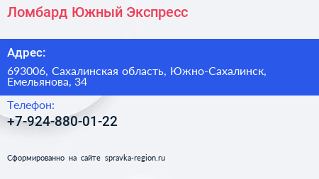 Ломбард Южный Экспресс по адресу 693006, Сахалинская область, Южно-Сахалинск, Емельянова, 34 в дальнейшем Организация, размещена в следующих категориях:
