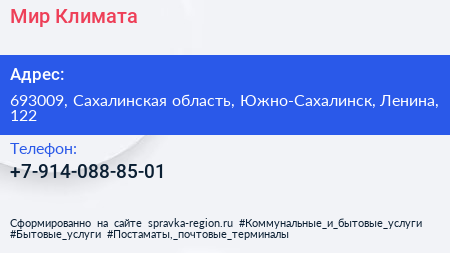 Мир Климата по адресу 693009, Сахалинская область, Южно-Сахалинск, Ленина, 122 в дальнейшем Организация, размещена в следующих категориях:
