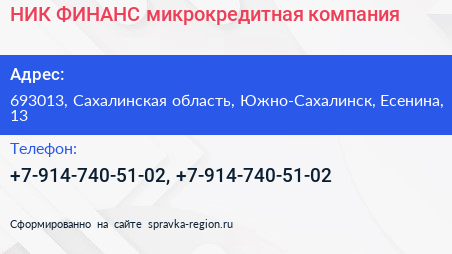 НИК ФИНАНС, микрокредитная компания по адресу 693013, Сахалинская область, Южно-Сахалинск, Есенина, 13 в дальнейшем Организация, размещена в следующих категориях: